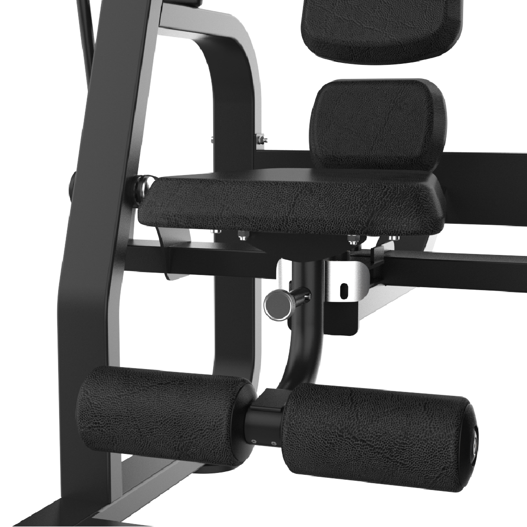 Le siège réglable en 3 positions du AXIS 027 permet d’aligner précisément la position du buste de chaque utilisateur par rapport à l’axe de rotation mécanique du bras de mouvement. Un alignement correct garantit que le coussin thoracique exerce la résistance au niveau optimal de la cage thoracique, maximisant la tension sur les abdominaux et protégeant la colonne lombaire. Un mauvais alignement génère des compensations parasites des fléchisseurs de la hanche et des contraintes mécaniques sur la colonne lombaire qui réduisent l’efficacité du travail abdominal. La molette chromée de réglage permet de trouver instantanément la position optimale pour chaque utilisateur, indépendamment de sa taille ou de sa morphologie.