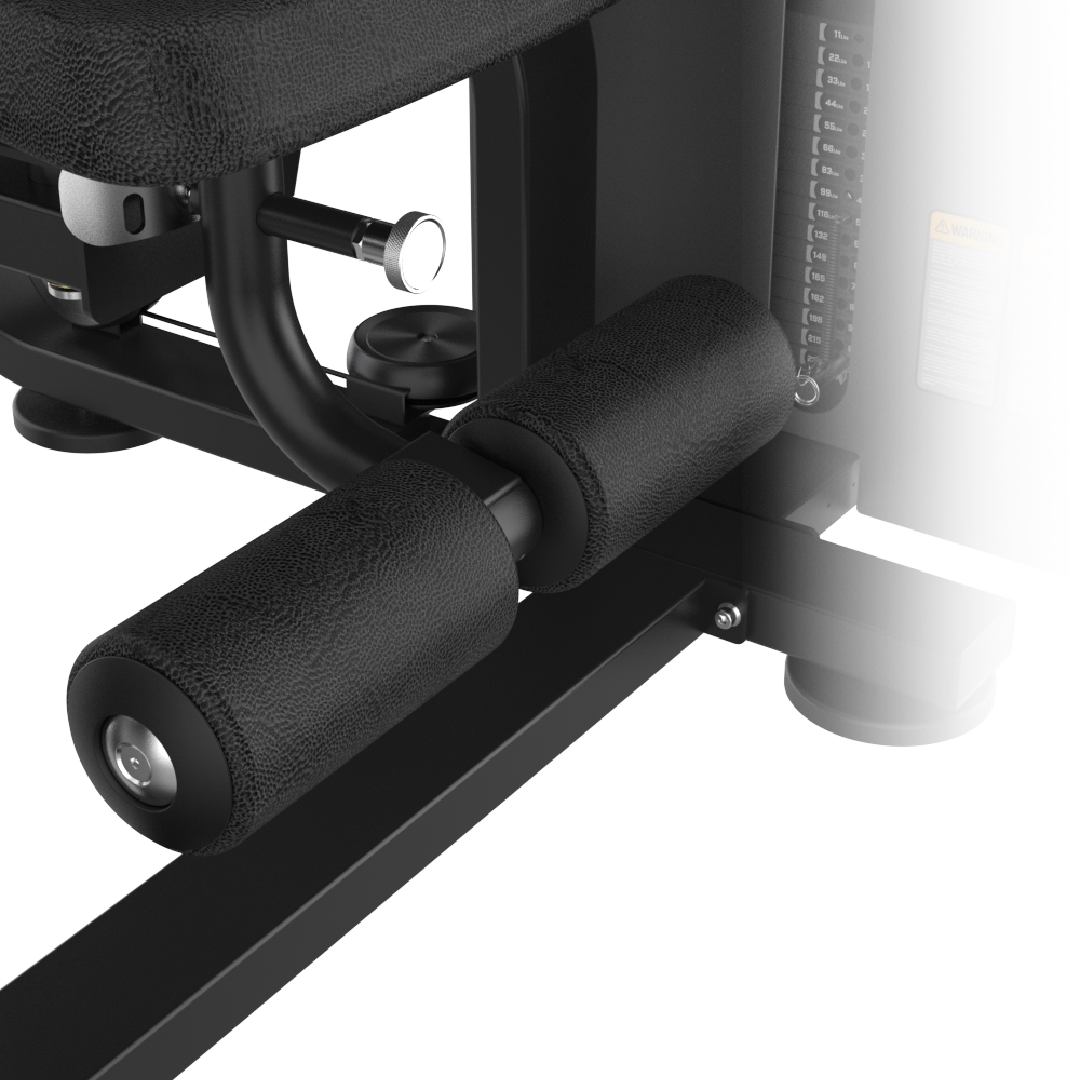 Système de soutien des jambes confortable : une stabilisation du bas du corps optimale Le système de soutien des jambes confortable est l’innovation de stabilisation la plus visible et la plus fonctionnelle du AXIS 027. Le double rouleau de blocage des jambes, généreusement dimensionné et recouvert du même similicuir noir grainé premium que l’ensemble des rembourrages de la gamme AXIS, maintient solidement les jambes et les chevilles en position pendant tout l’effort de flexion abdominale. Ce maintien du bas du corps joue un rôle fondamental dans la qualité et la sécurité de l’exercice de crunch : il fixe le bassin et le bas du corps en position stable, éliminant toutes les compensations parasites des fléchisseurs de la hanche souvent observées lors des crunchs sans maintien des jambes. En immobilisant les membres inférieurs, le système de soutien des jambes garantit que l’effort de flexion du tronc est strictement ciblé sur les muscles abdominaux ciblés, maximisant la tension musculaire et l’efficacité de chaque répétition. La molette chromée de réglage permet d’ajuster la position du double rouleau à l’épaisseur des chevilles et des jambes de chaque utilisateur, garantissant un maintien ferme et confortable pour tous les gabarits.