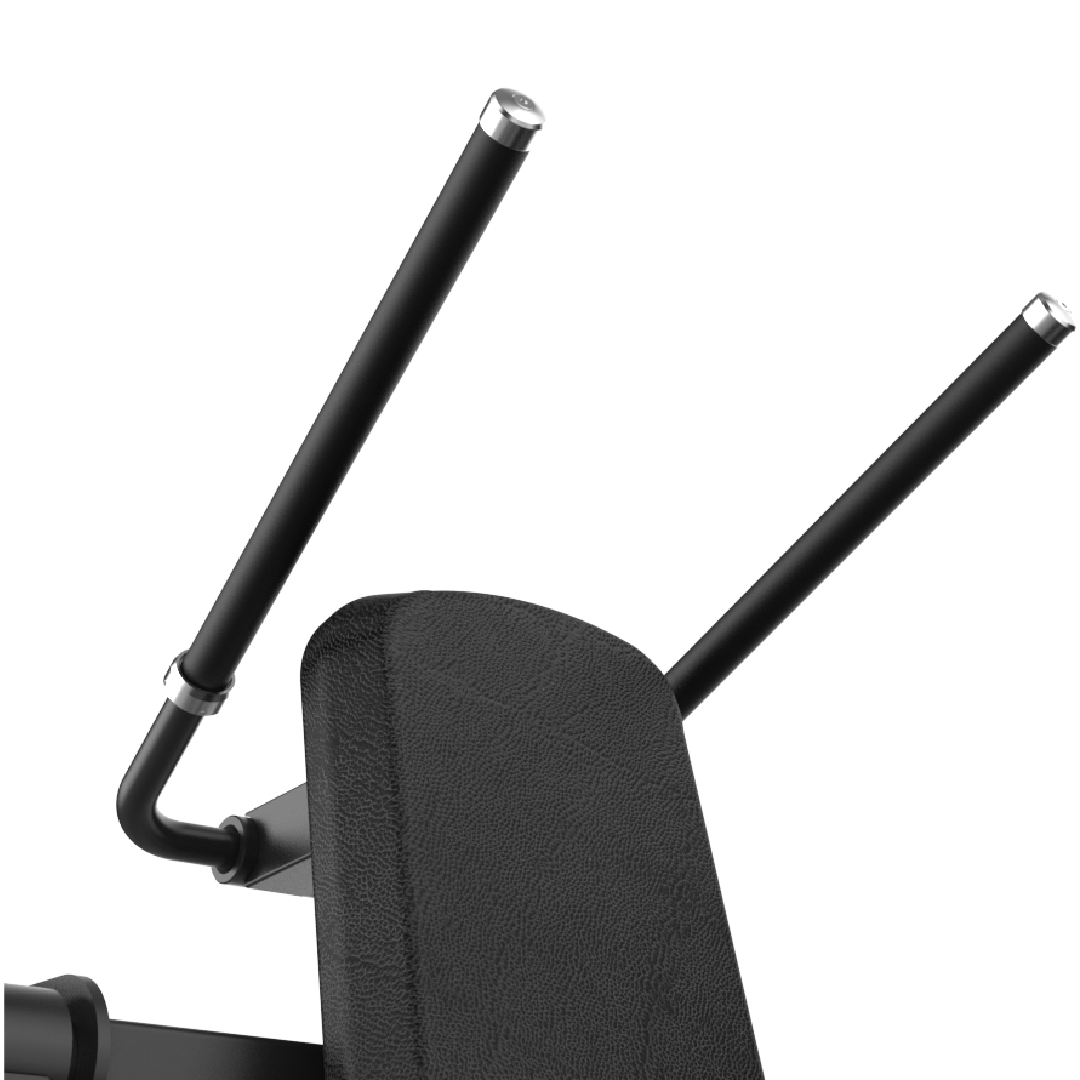 Poignées extra-longues enrobées de caoutchouc : une prise en main naturelle et sécurisée Les poignées extra-longues enrobées de caoutchouc du AXIS 027 constituent l’innovation ergonomique la plus distinctive de la machine. Ces deux barres tubulaires divergentes extra-longues, recouvertes d’un enrobage caoutchouté noir antidérapant et finies par des embouts chromés signature AXIS, sont positionnées selon un angle d’ouverture soigneusement calculé pour respecter l’axe naturel des épaules et des coudes en position de crunch. Leur longueur extra-longue permet à l’utilisateur de saisir les poignées à la hauteur et à la largeur exactement adaptées à sa morphologie et à ses préférences, éliminant toute contrainte d’adaptation à une position de prise imposée. L’enrobage caoutchouté absorbe les vibrations, offre une prise en main ferme et confortable quelle que soit l’intensité de la contraction, et réduit la fatigue des avant-bras pendant les séries longues. Ces poignées permettent à l’utilisateur de s’appuyer légèrement pendant l’effort de flexion pour se concentrer totalement sur la qualité de la contraction abdominale ciblée, sans dispersion d’énergie dans la recherche d’équilibre ou de stabilisation.