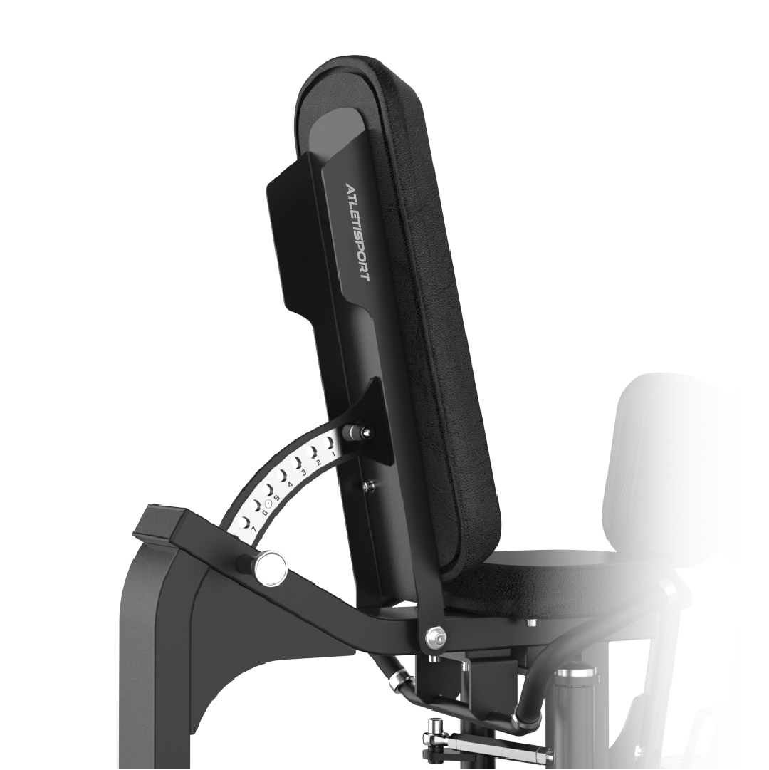 Dossier réglable en 10 positions : une personnalisation biomécanique de précision Le dossier réglable en 10 positions est l’innovation de personnalisation fondamentale du AXIS 020. Ce dossier soigneusement conçu, doté d’un rail gradué multi-positions numéroté de 1 à 7+ et d’une molette de blocage chromée de précision visible clairement sur la photo de détail, offre 10 positions d’inclinaison distinctes couvrant un spectre de réglage large et précis. L’inclinaison du dossier influence directement la position du bassin pendant l’exercice, modifiant l’angle de travail des muscles ciblés et donc le ciblage musculaire de chaque séance. Un dossier plus vertical maintient le bassin en position neutre et cible les abducteurs et adducteurs dans leur axe de travail standard. Un dossier légèrement incliné vers l’arrière augmente l’antéversion du bassin, accentuant le recrutement du grand fessier et des fessiers profonds pendant l’abduction. Ces 10 positions permettent également d’adapter l’inclinaison du dossier à la morphologie et à la mobilité des hanches de chaque utilisateur, garantissant une position de travail confortable et biomécanique idéale pour tous les gabarits et tous les niveaux de mobilité.