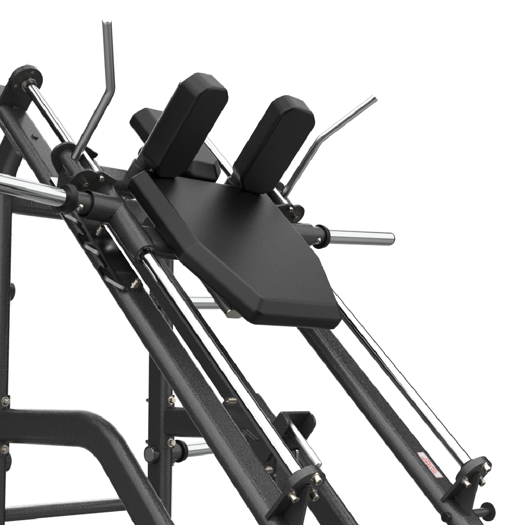 Une construction massive à toute épreuve pour les charges les plus importantes Fabriqué autour d’une structure en acier épais haute résistance avec une base rectangulaire large et renforcée aux multiples pieds massifs et renforts structurels généreux, le IMPACT 036 est conçu pour supporter des charges importantes lors d’une utilisation professionnelle quotidienne intensive. Son architecture de cadre incliné soigneusement calculé garantit une stabilité et une rigidité absolues à chaque répétition, quelle que soit la charge chargée sur les cornières chromées du chariot. Les nombreux boulons et axes chromés visibles sur les jonctions structurelles témoignent d’une attention méticuleuse portée à la solidité de chaque point de la machine.
