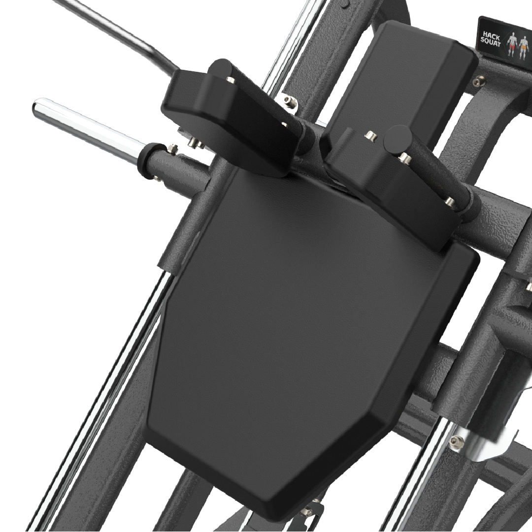 Soutien ergonomique et confort : un maintien du haut du corps anatomique et précis Le soutien ergonomique et confort est l’innovation de confort la plus distinctive et la plus fonctionnelle du IMPACT 036. Le chariot est équipé d’un système de soutien du haut du corps à trois éléments complémentaires soigneusement conçus. Le double coussin d’épaule anatomique noir mat, composé de deux coussins indépendants séparés et arrondis plutôt que d’une barre unique, distribue la charge sur les deux trapèzes de manière individualisée et anatomique, s’adaptant naturellement à la largeur d’épaules de chaque utilisateur et éliminant les points de pression inconfortables souvent associés aux barres transversales rigides classiques. Le coussin dorsal et lombaire en losange noir mat, soigneusement dimensionné et positionné à mi-hauteur du dos, offre un maintien dorsal continu depuis les épaules jusqu’aux lombaires, protégeant la colonne vertébrale dans sa courbure naturelle pendant toute l’amplitude du hack squat. Les deux poignées latérales coudées chromées, positionnées à hauteur naturelle des mains en position de hack squat, offrent un point d’appui intuitif et sécurisé permettant à l’utilisateur de s’ancrer solidement pendant l’effort de poussée.