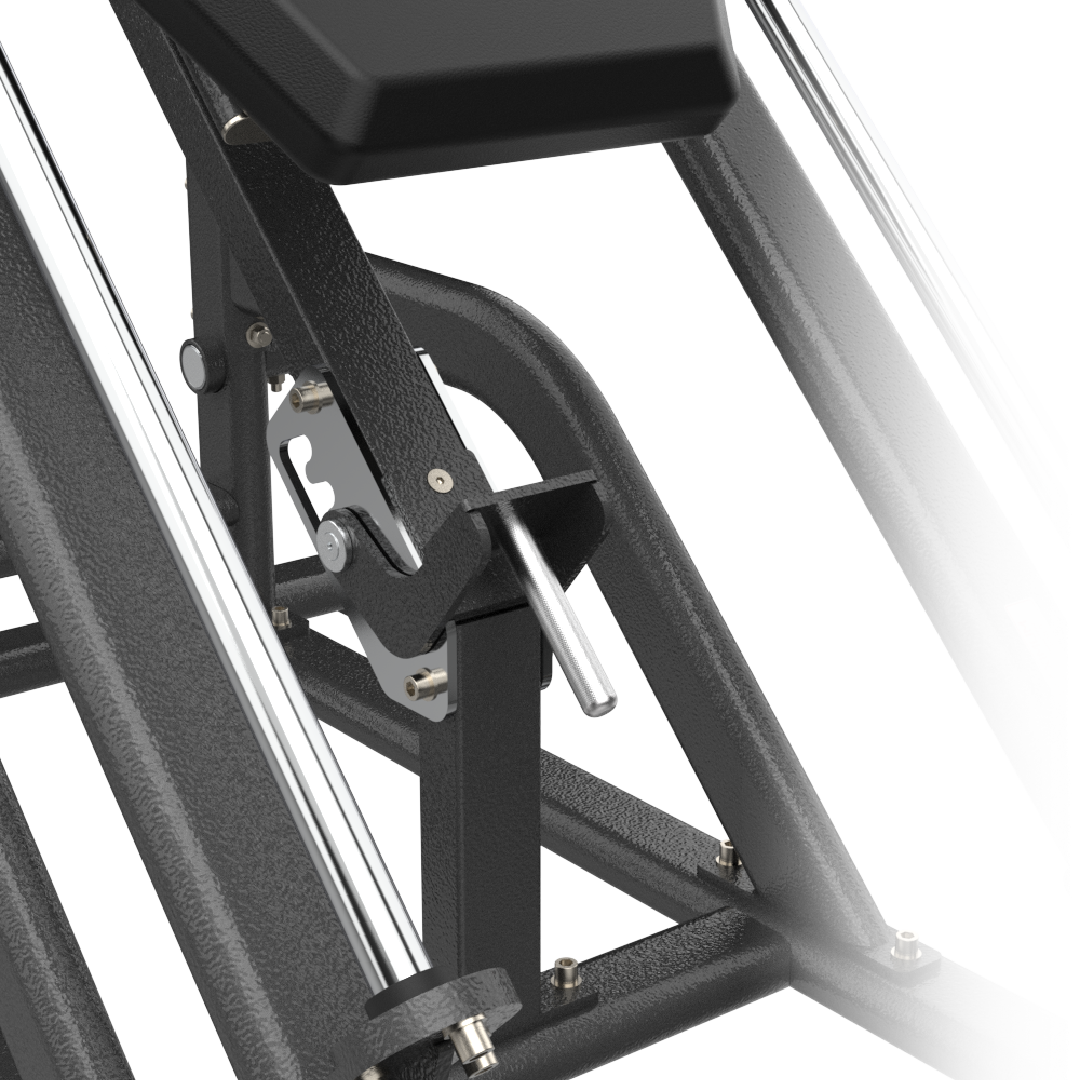 Le système d’ajustements flexibles de la limite de sécurité du IMPACT 036 utilise un levier chromé sur mécanisme articulé positionné sur le cadre incliné, permettant de définir précisément la profondeur minimale de descente du chariot. En positionnant le levier à la hauteur souhaitée, l’utilisateur définit l’amplitude maximale de flexion autorisée pendant l’exercice. Ce réglage est fondamental pour les pratiquants présentant des limitations de mobilité articulaire, pour les protocoles de rééducation nécessitant un travail en amplitude partielle contrôlée, et pour les programmes de préparation physique de groupe nécessitant une standardisation de l’amplitude. La flexibilité de ce réglage, avec ses multiples positions finement ajustables, garantit une protection articulaire et une personnalisation de l’amplitude optimales pour tous les profils d’utilisateurs.