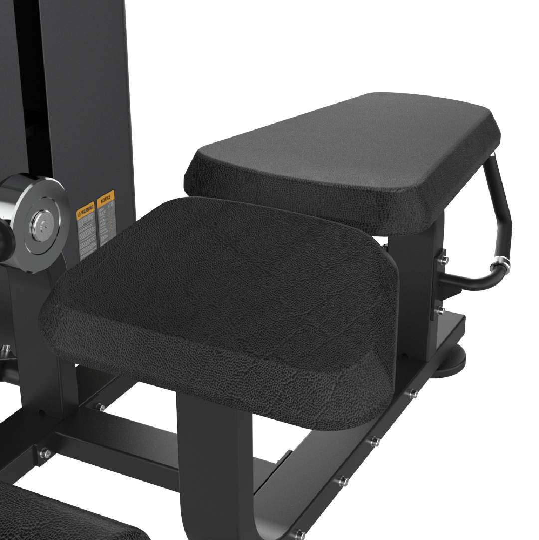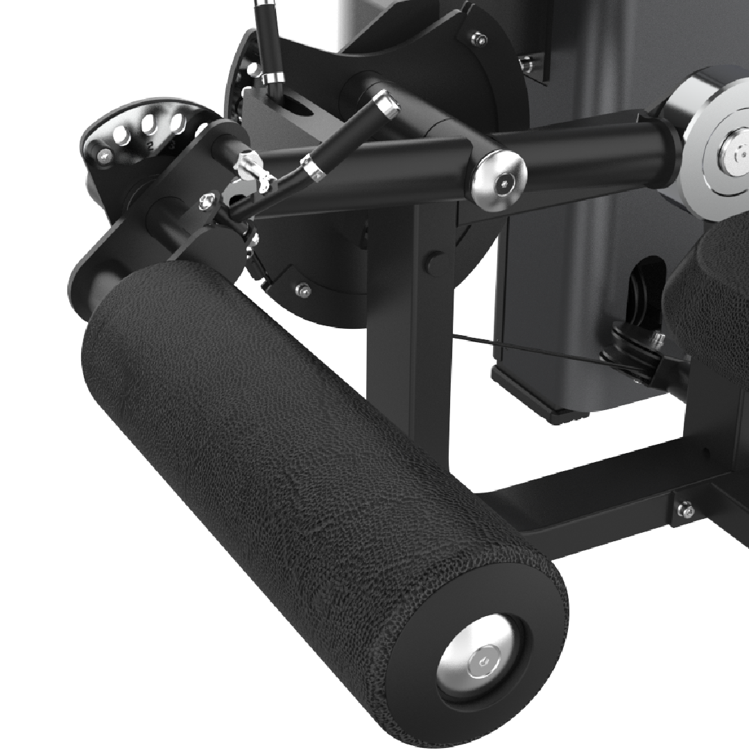 Le rouleau inférieur réglable est un grand rouleau de contact recouvert de similicuir grainé premium dont la position est entièrement ajustable en hauteur et en distance par rapport à l’axe de rotation du mécanisme. Cette réglabilité est fondamentale pour deux raisons biomécaniques : elle permet d’aligner le point de contact du rouleau avec les chevilles à la distance optimale du genou pour maximiser le bras de levier et la tension sur les ischio-jambiers, et elle permet d’ajuster la position de départ du rouleau selon la longueur des tibias de chaque utilisateur, garantissant une trajectoire de flexion biomécanique idéale pour tous les gabarits. Cette précision de réglage est caractéristique des machines à leg curl allongé professionnelles les plus haut de gamme du marché.