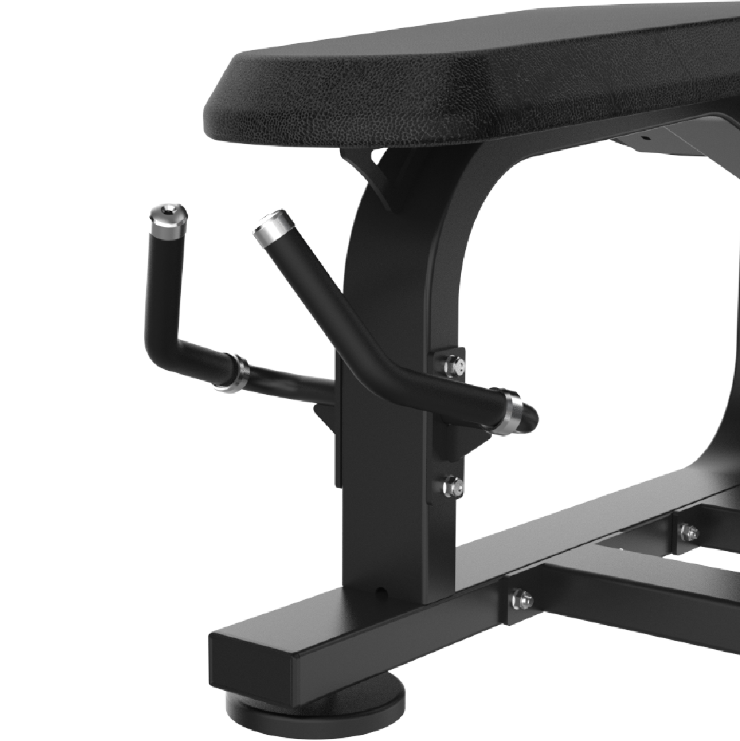 Design de poignées ergonomique : sécurité, stabilité et confort en position allongée Le design de poignées ergonomique du AXIS 015 est un détail fonctionnel soigneusement pensé qui distingue radicalement cette machine des leg curl allongés classiques. La double poignée tubulaire coudée à embouts chromés, positionnée sous le bord avant du banc à hauteur naturelle des mains en position allongée, permet à l’utilisateur de s’ancrer solidement pendant l’effort de flexion des jambes. Ce point d’ancrage fixe joue trois rôles fondamentaux pendant l’exercice. Il stabilise le buste et le bassin contre le banc pendant l’effort de flexion, éliminant le soulèvement compensatoire du bassin souvent observé lors des leg curl allongés sans poignée ou avec des poignées mal positionnées. Il permet de générer une force de contre-pression descendante pendant la flexion, augmentant la tension musculaire sur les ischio-jambiers et la qualité de la contraction en fin de mouvement. Il offre un point de stabilisation psychologique rassurant qui encourage l’utilisateur à aller chercher des charges plus importantes et des amplitudes de mouvement plus complètes, favorisant la progression en force sur le long terme.