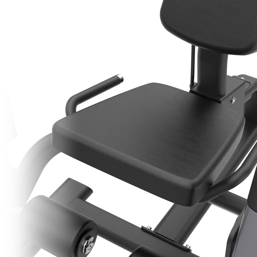 Le siège ergonomique ajustable, le dossier incliné et le rouleau de jambe réglable assurent un positionnement optimal et un confort maximal. Sa structure en acier renforcé, ses axes de rotation de précision et ses supports de disques intégrés garantissent une robustesse et une durabilité exceptionnelles, même en usage intensif.