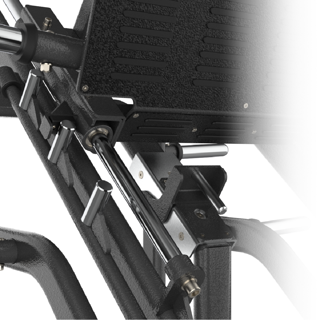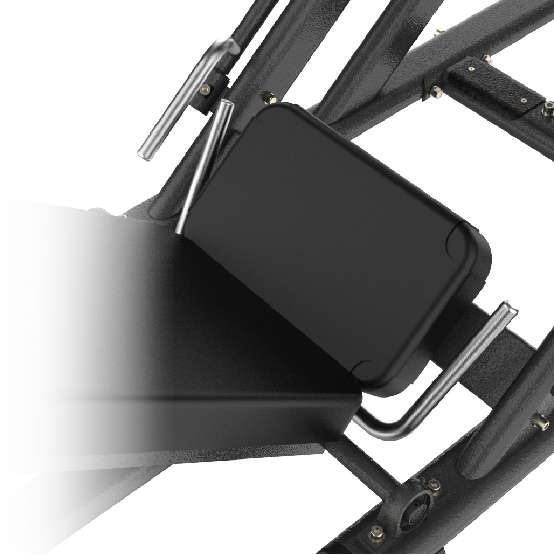 Système de soutien ergonomique : un dossier adaptatif pour toutes les morphologies Le système de soutien ergonomique du IMPACT 019 repose sur un dossier long inclinable équipé d’un mécanisme d’ajustement chromé à crochet, visible sur la photo de détail, permettant de régler l’angle d’inclinaison du dossier selon les préférences et la morphologie de chaque utilisateur. Ce dossier inclinable joue un rôle fondamental dans la qualité et la sécurité de l’exercice de presse linéaire : en maintenant le buste dans l’inclinaison optimale pendant la poussée, il protège la colonne vertébrale et les disques intervertébraux lombaires des contraintes de flexion excessive liées à l’effort de presse. L’inclinaison réglable permet d’adapter la position du buste à la longueur des fémurs et à la flexibilité des hanches de chaque utilisateur, garantissant une position de travail biomécanique idéale pour tous les gabarits. Le mécanisme d’ajustement chromé à crochet, robuste et fiable, assure un verrouillage ferme et sécurisé dans chaque position sélectionnée.